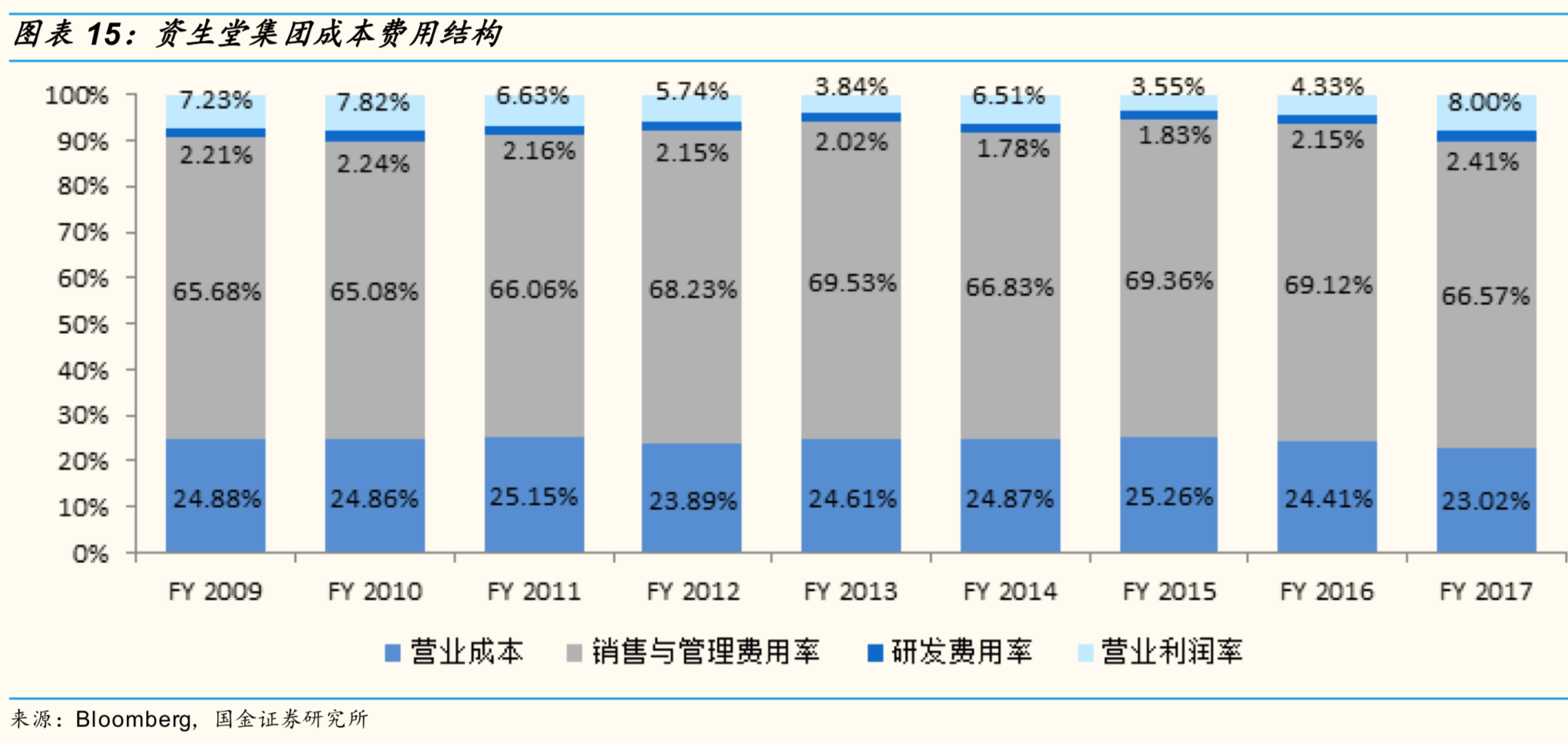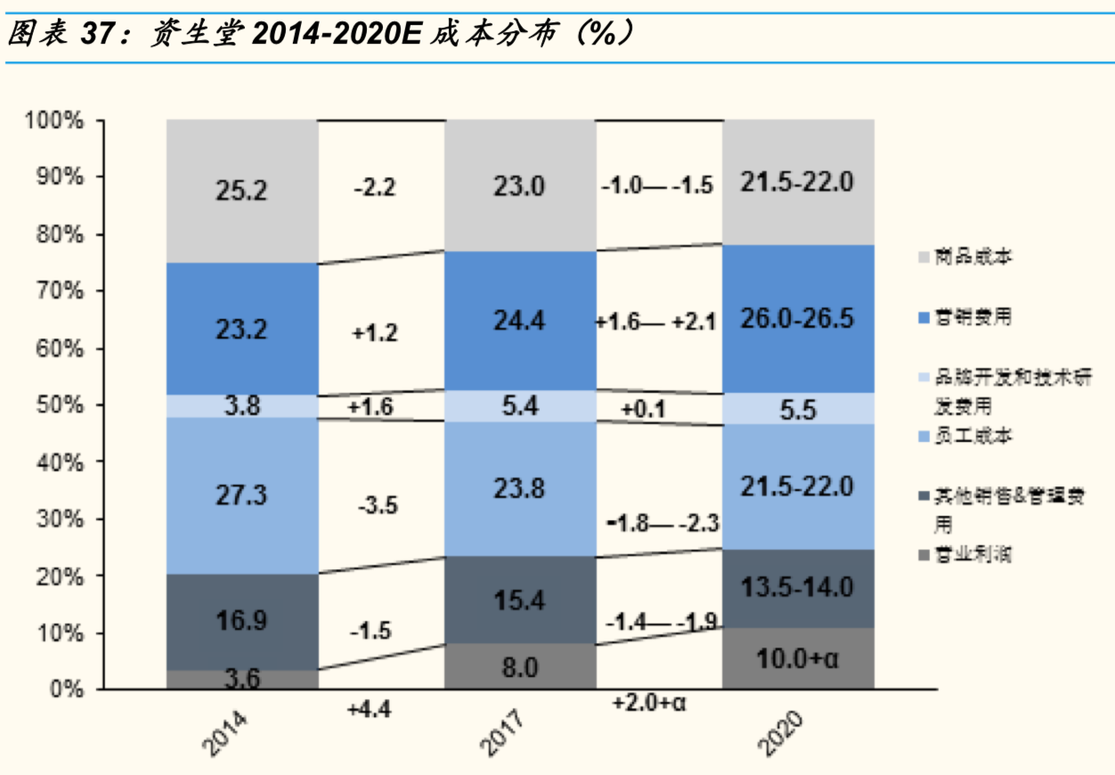 代言人是品牌潛在消費者“夢想”的具象反映,資生堂也一直選擇簽約一線演員和明星來擔(dān)任品牌代言人。例如旗下 CPB 品牌 2012 年曾簽下周迅作為亞洲區(qū)品牌大使,2018 年初簽約奧斯卡獎提名女演員 Felicity Jones 為其品牌代言人,2018 年 9 月簽約章子怡為其品牌大使。某種程 度上來講,越一線的代言人往往代 表著對于廣大女性消費者營造出了越具有吸引力的“夢想”。2014-2017年資生堂的成本結(jié)構(gòu)變化中,品牌營銷費用率由 23.2%上升 1.2pct至 24.4%,品牌開發(fā)&技術(shù)研發(fā)費率由 3.8%上升 1.6pct 至 5.4%,而其他成本項目均有不同程度的下降。而在資生堂的 VISION2020 戰(zhàn)略中,也明確提出將進一步加大營銷投入,預(yù)計2017-2020 年將品牌營銷費用率由 24.4%提升 1.6pct~2.1pct 至 26%~26.5%。
