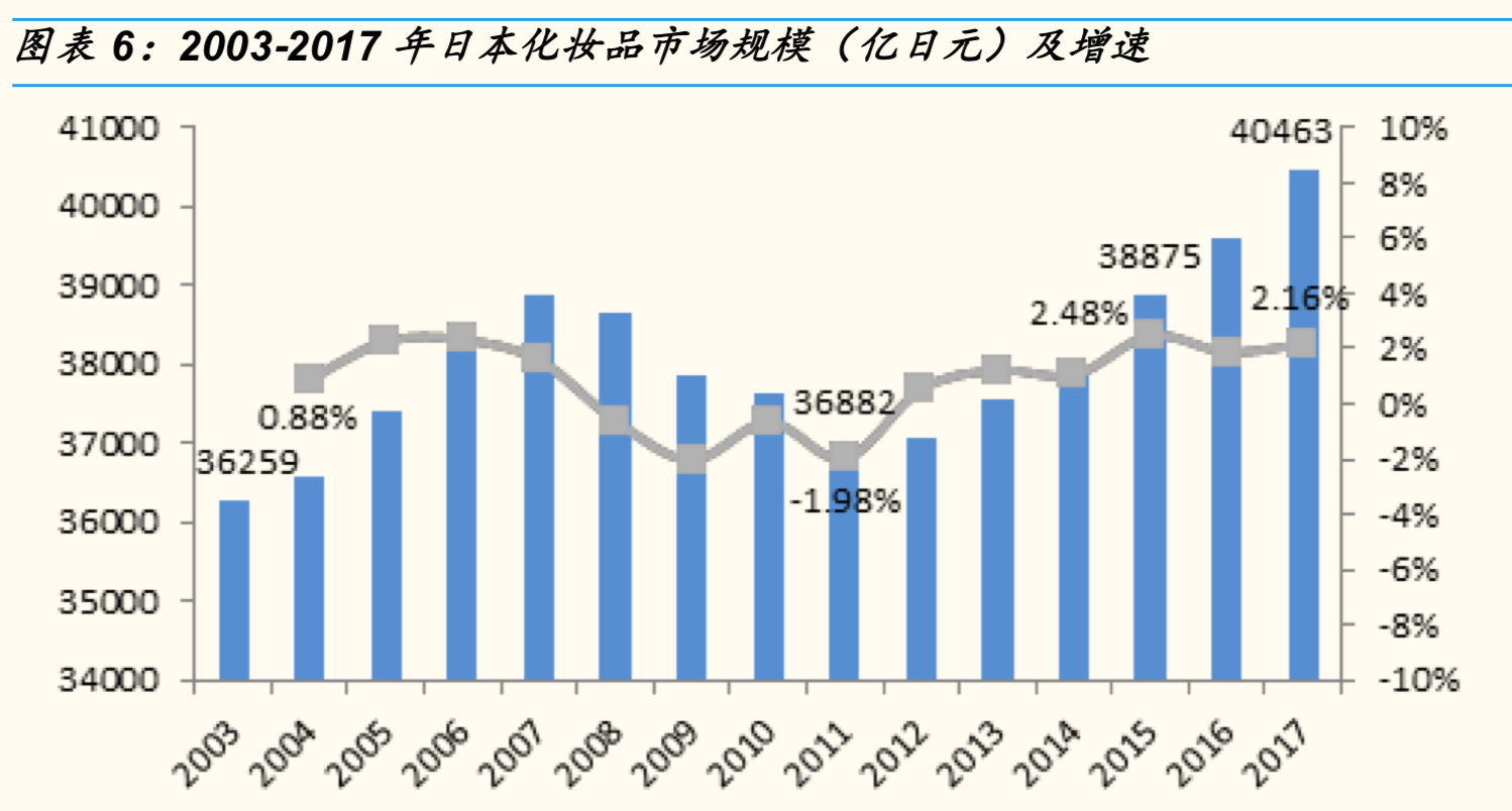 2017 年日本化妝品行業(yè)市場規(guī)模為 40,463 億日元,同比+2.16%:根據(jù) Euromonitor 數(shù)據(jù),2003-2017 年,2003-2017 年,日本化妝品行業(yè)的市場規(guī)模由 36,259 億日元增長至 40,463 億日元,每年的增長率在-2%~+2% 左右,與日本 GDP 增速接近。從市場結(jié)構(gòu)來看,日本化妝品行業(yè)的高端市場占比高于。2003-2017 年,日本化妝品行業(yè)高端市場占比為 42%- 45%,大眾市場占比為 55%-58%,高端市場和大眾市場規(guī)?;酒椒痔煜?。
