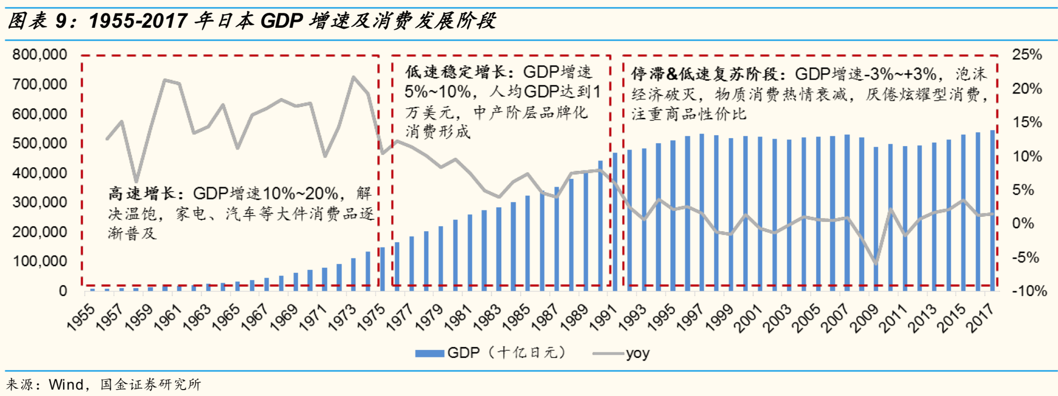 1955 年至今,日本經(jīng)歷了高速增長、低速穩(wěn)定增速和停滯&低速復(fù)蘇的 3 次經(jīng)濟增速換擋:11955-1974,GDP 增速 10%~20%,國民在解決溫飽基礎(chǔ)上,家電、汽車等大件消費品逐漸普及;21975-1991,GDP 增速 5%~10%,人均 GDP 突破 1 萬美元,中產(chǎn)階層品牌消費觀形成,化妝品 行業(yè)迎來蓬勃發(fā)展;31992 年至今,泡沫經(jīng)濟破滅,GDP 增速-3%~3%,國民更看重商品性價比。