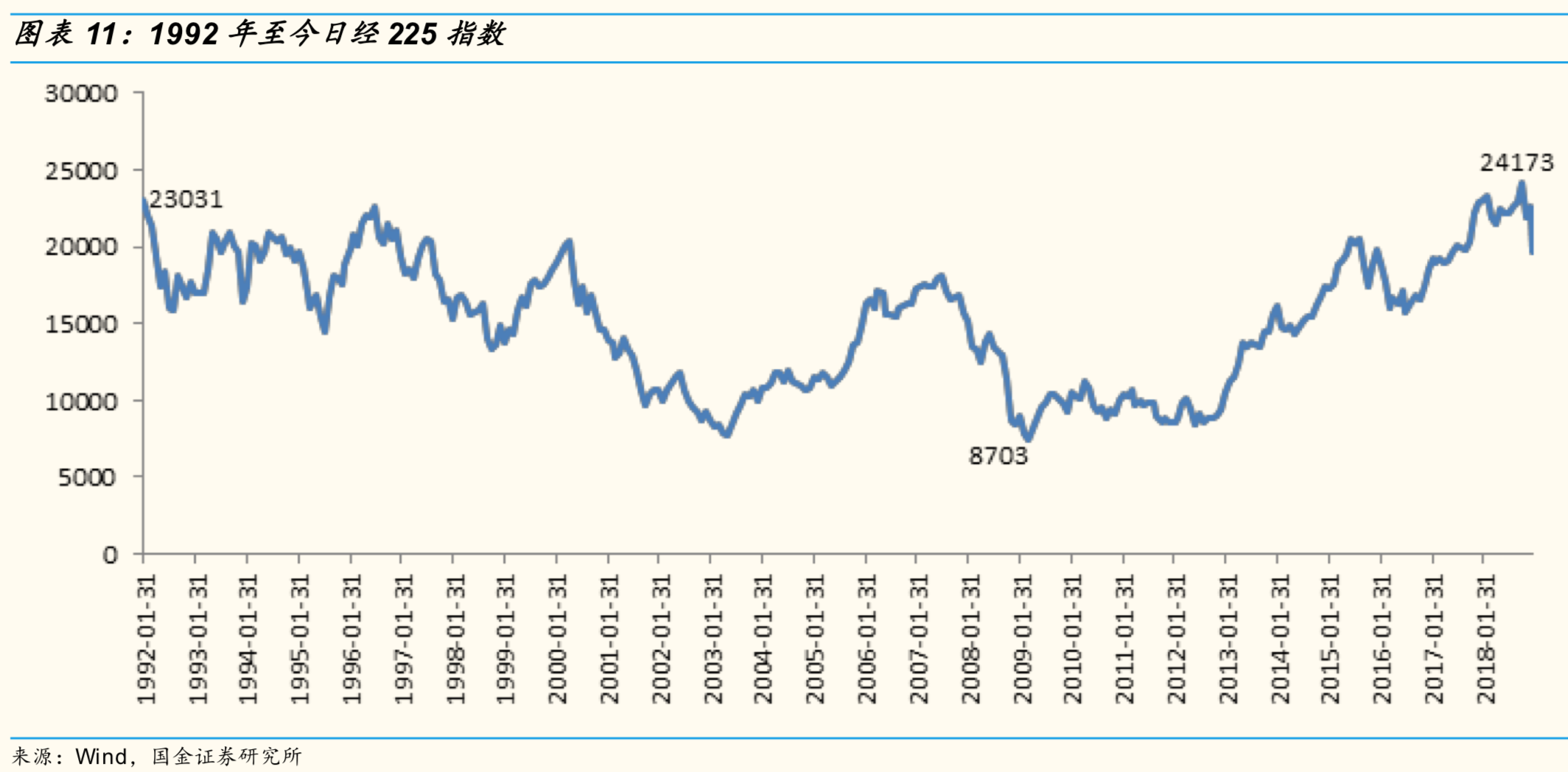 1992 年日本泡沫經(jīng)濟破滅后,直接的影響就是資產(chǎn)價格的嚴(yán)重縮水。1992 年以來日本 10 年期國債收益率不斷走低,整個社會資產(chǎn)回報率不斷下降。1992 年日經(jīng) 22 指數(shù)曾經(jīng)高達 23000 點以上,泡沫經(jīng)濟破滅后,日經(jīng) 225 指數(shù)迅速跌破 2 萬點,在 1992 年到 2012 年“失去的 20 年間”,日 經(jīng)225 指數(shù)曾一路下行至 8000 點附近,直到 2013 年起才開始上行趨勢,在 2017、2018 年才上行至和 1992 年相近的 23000 點附近。