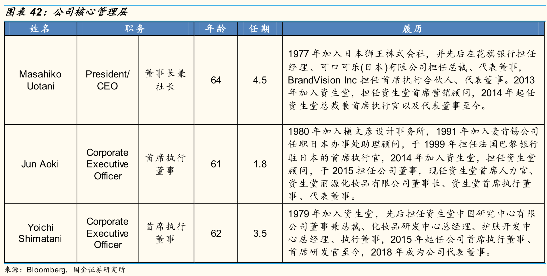 外國投資者持股比例高達 41%:從股東地域來看,資生堂的日本股東占比為 59%,外國投資者持股占比接近 41%,美國投資者持股比例為 26.61%,位居外國投 資者持股,反映出國外投資者資生堂發(fā)展的長期看好。2014 年公司迎來首位外部 CEO 魚谷雅彥(Masahiko Uotani),帶領(lǐng)公司實現(xiàn)銷售額的大幅度增長:從福原信三起至今,資生堂已歷經(jīng) 17 任社長,其中有三位來自福 原家族 ,除魚谷雅彥外其他均由內(nèi)部培養(yǎng),內(nèi)部培養(yǎng)掌舵人一直是日本企業(yè)的傳統(tǒng)。2014 年在資生堂業(yè)績承壓之時,公司打破了歷史傳統(tǒng),聘請曾任可口可樂日本公司 的總裁兼執(zhí)行官的魚谷雅彥為集團總裁兼執(zhí)行官,反映出資生堂 在面臨當(dāng) 前時代競爭的勇敢變革。魚谷雅彥上任后,帶領(lǐng)公司制定了中長期規(guī)劃Vision2020,并在 2015- 2017 年實現(xiàn)了銷售額的大幅增長。