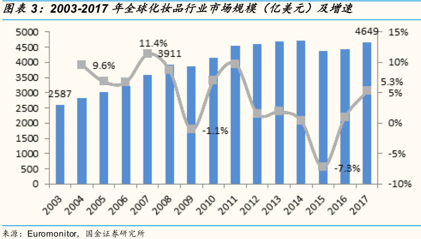 2017 年化妝品行業(yè)市場規(guī)模為 4649 億美元,同比+5.3%:根據(jù) Euromonitor 數(shù)據(jù),2003-2017 年,日本化妝品行業(yè)的市場規(guī)模由2587億美元增長至 4649 億美元,近 14 年復(fù)合增速為4.28%。從市場結(jié)構(gòu)來看, 2003-2017 年,化妝品行業(yè)高端和大眾市場占比基本穩(wěn)定,其中高端市場占比為 27%-29%,大眾市場占比為 71%-73%,大眾市場規(guī)模是高端市場規(guī)模的 2.4-2.7 倍。