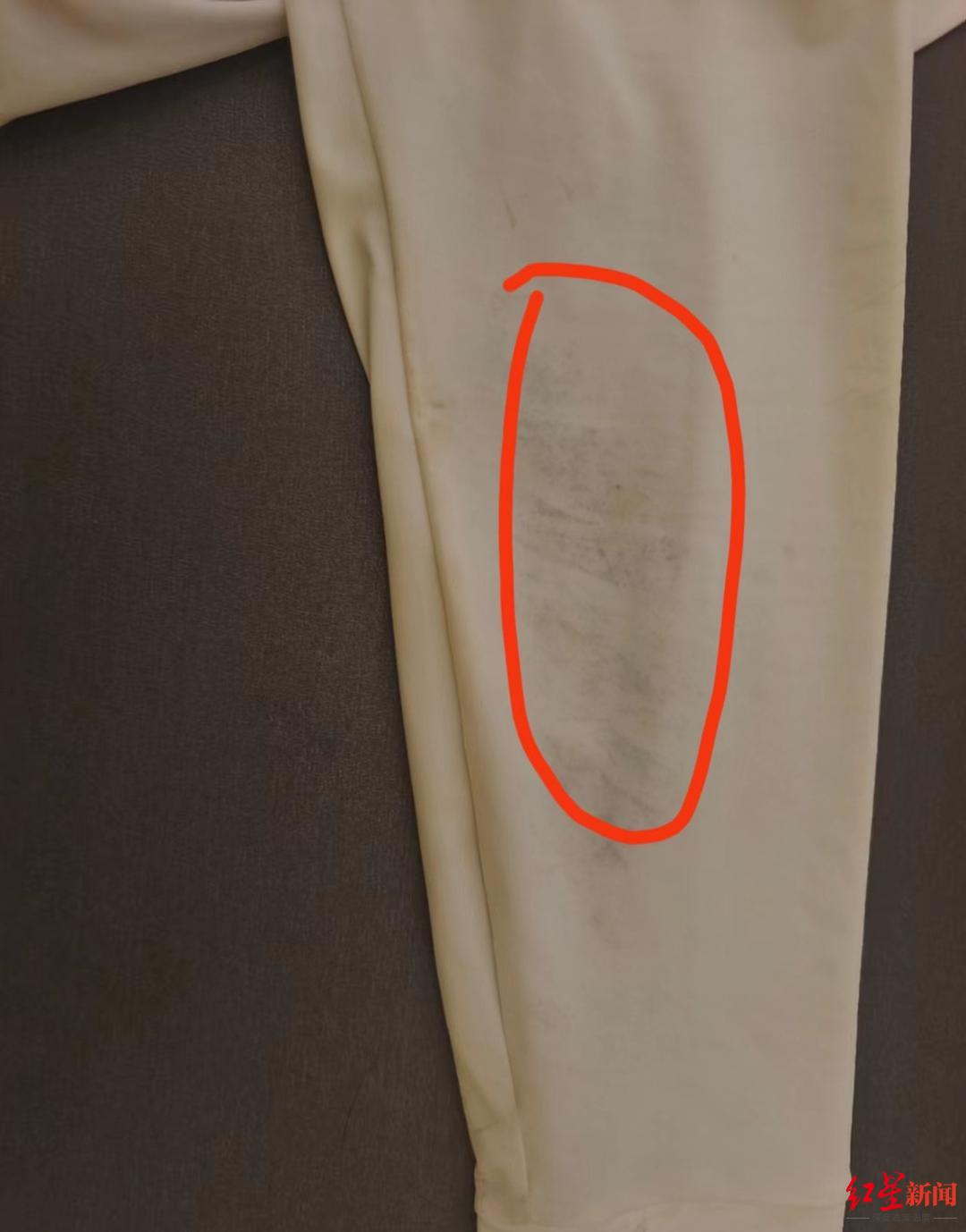 ↑王女士將防曬衣用水沖了沖,卻發(fā)現(xiàn)衣服掉膠了