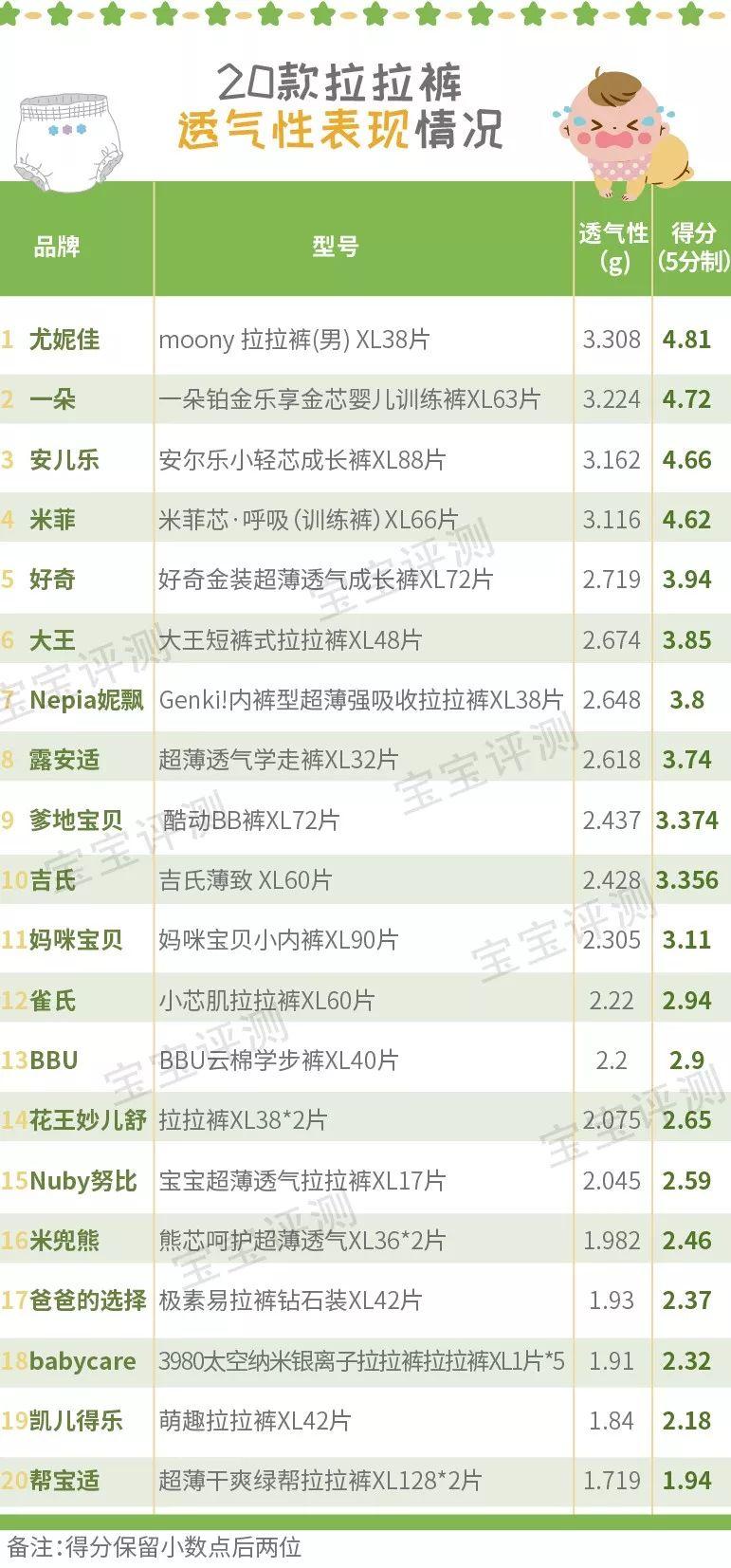 2、這里需要提示一下,拉拉褲的輕薄程度(參見下面的評測結果)和透氣并沒有正相關的關系,比如幫寶適,在20款中是輕薄的,但透氣性卻是得分墊底的。其他類似的還有安兒樂、好奇等產(chǎn)品。