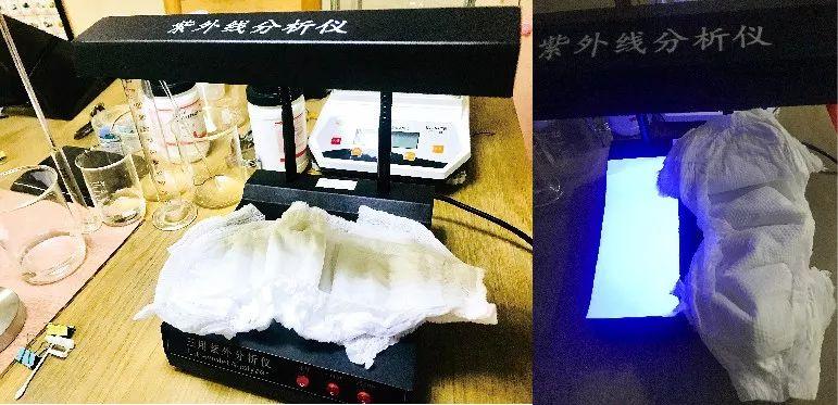 來看看在紫外分析儀下,普通加了熒光增白劑的A4紙和拉拉褲的熒光反應對比,A4紙會發(fā)出明艷的熒光(如右圖)。