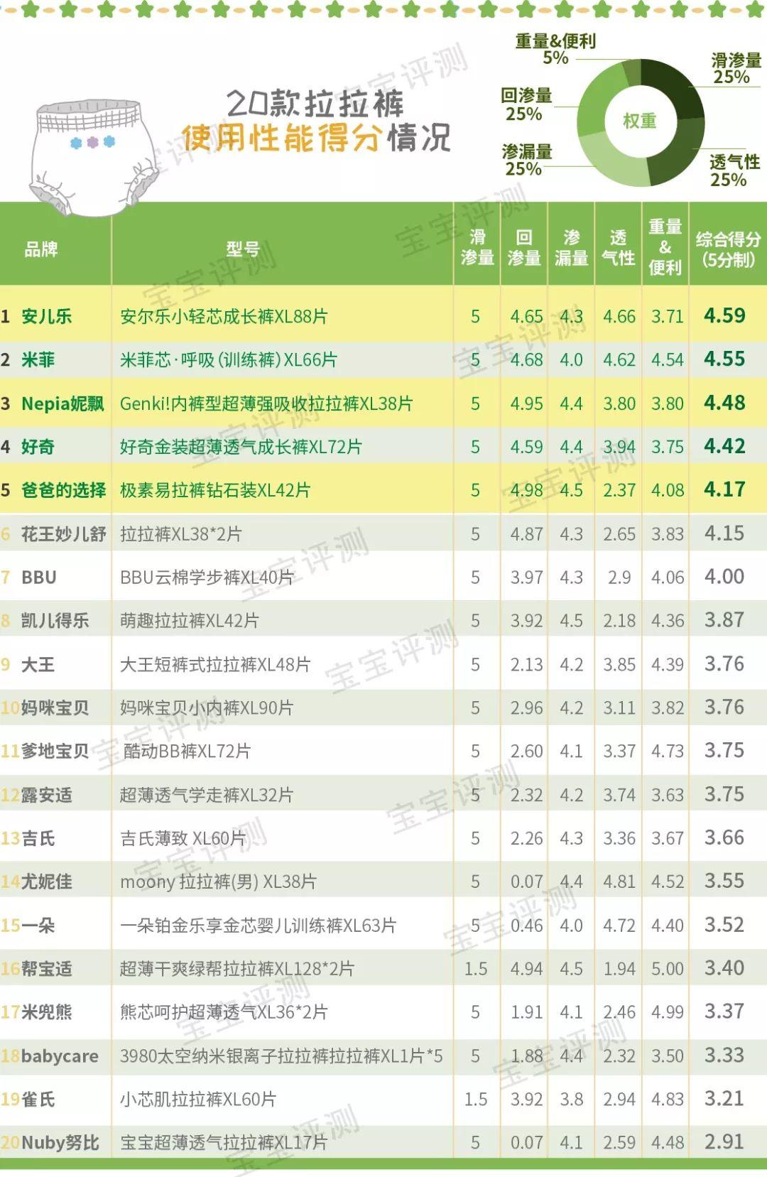 五綜合評測:推薦爸爸的選擇拉拉褲的層層評測到這兒終于結束了,笨爸爸對使用性能、主觀體驗兩大項目賦予不同的權重:使用性能評測占比50%,寶媽體驗評測占比50%。