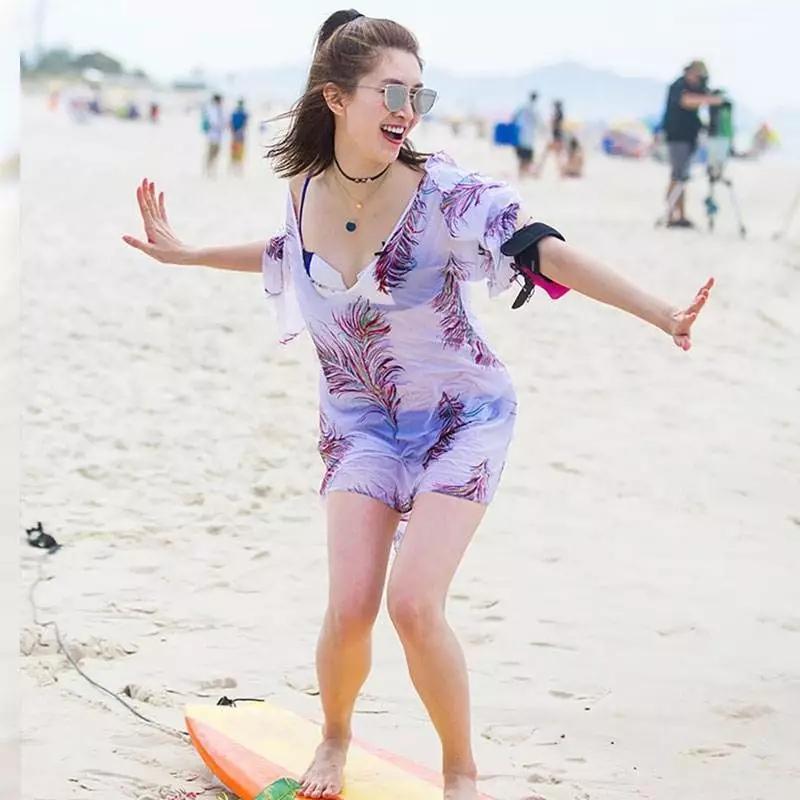 有些妹子覺得開衫設(shè)計(jì)的防曬服有時(shí)候有點(diǎn)拖沓,不方便活動(dòng),罩衫款式的防曬服恰好能彌補(bǔ)這一缺點(diǎn),整體穿搭顯得更加干脆利落。江疏影身穿泳衣搭配淺色印花罩衫,美好的身材曲線若隱若現(xiàn),保守中略帶一絲性感女人味,扎上半馬尾發(fā)型更加甜美嬌俏,成為沙灘上一道靚麗的風(fēng)景線。