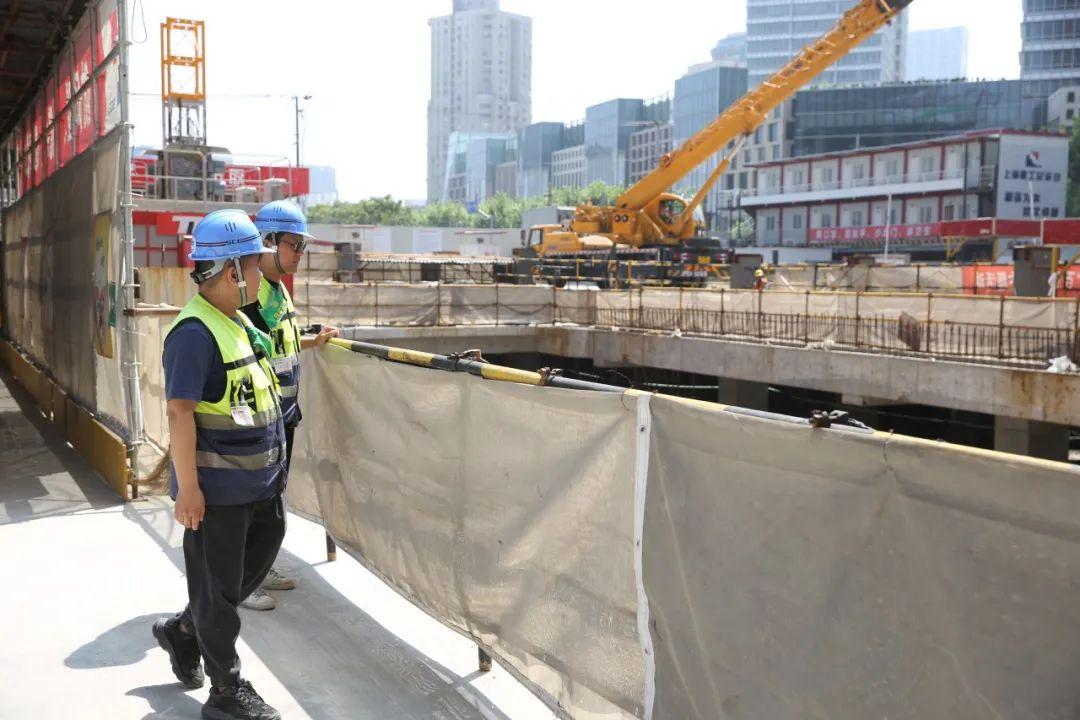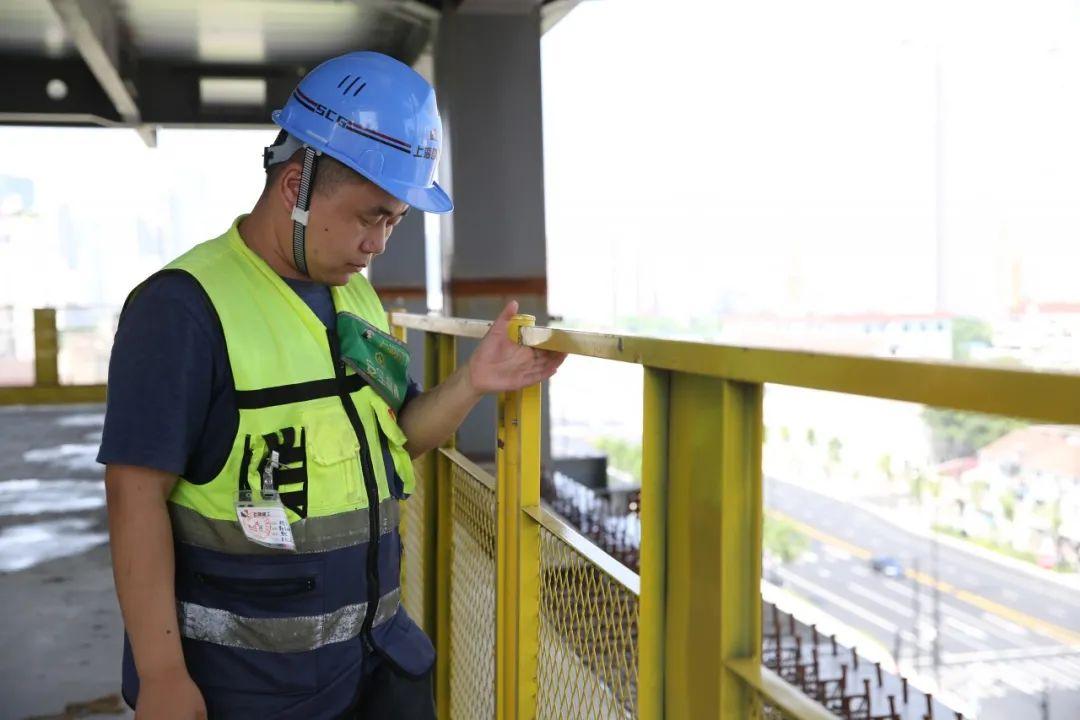 “師傅,帽戴好,不能為貪圖涼快就隨便脫帽子啊?!鄙衔?點(diǎn),正在北外灘核心區(qū)域92號(hào)地塊工地巡查的監(jiān)督員華騰飛,朝著一位正在樓層內(nèi)作業(yè)的工人喊道。工人連忙撿起帽戴上。隨后,華騰飛沿著由鋼管、鐵板搭建而成的樓梯,走上在建高樓7樓的平臺(tái)。平臺(tái)一側(cè),設(shè)有鐵制圍擋,華騰飛一邊檢查固定圍擋的螺絲是否安裝到位,一邊用手輕推看其是否晃動(dòng)……