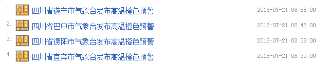 截止中午12點,四川遂寧、巴中、德陽、宜賓、4市發(fā)布高溫橙色預(yù)警↓