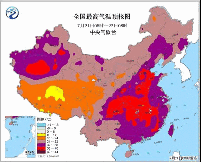 預(yù)計7月21日白天,陜西南部、華北東南部、內(nèi)蒙古東部偏南地區(qū)、黃淮、江淮、江漢、江南、華南北部和東部、四川東部、貴州東部、重慶、新疆南疆盆地等地高氣溫35~36℃,其中,陜西南部、山東西部、河南北部、安徽南部、湖北、湖南北部、江西北部和西部、四川東部、重慶、新疆南疆盆地等地的部分地區(qū)高氣溫37~39℃,局地可達(dá)40℃。