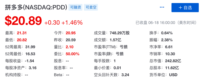 自2015年成立一來,拼多多一直因假貨飽受爭議,但其低廉的價格確實俘獲了潛力巨大的下沉市場,2018年7月,毀譽參半的拼多多納斯達(dá)克掛牌上市。截止美東事件6月18日收盤,拼多多每股價格20.89億美元,總市值242.82億美元。