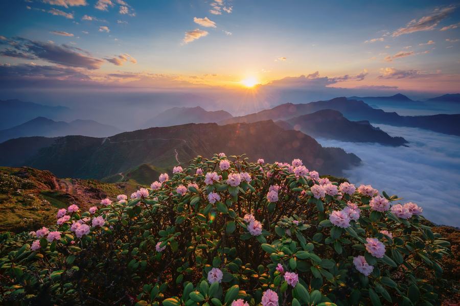 夕陽:隨著天色漸漸變暗,太陽慢慢西沉,天邊也變成血紅色,夕陽把這片翻滾的云海渲染得更加燦爛,沒想到高原的黃昏竟是如此絢麗多彩。透過鏡頭看眼前的云海,夕陽給這片金色的海洋增添了更多的絢爛和輝煌,那些隨著翻滾的云海起伏的山巒更是為這片美景增添了幾分神韻。