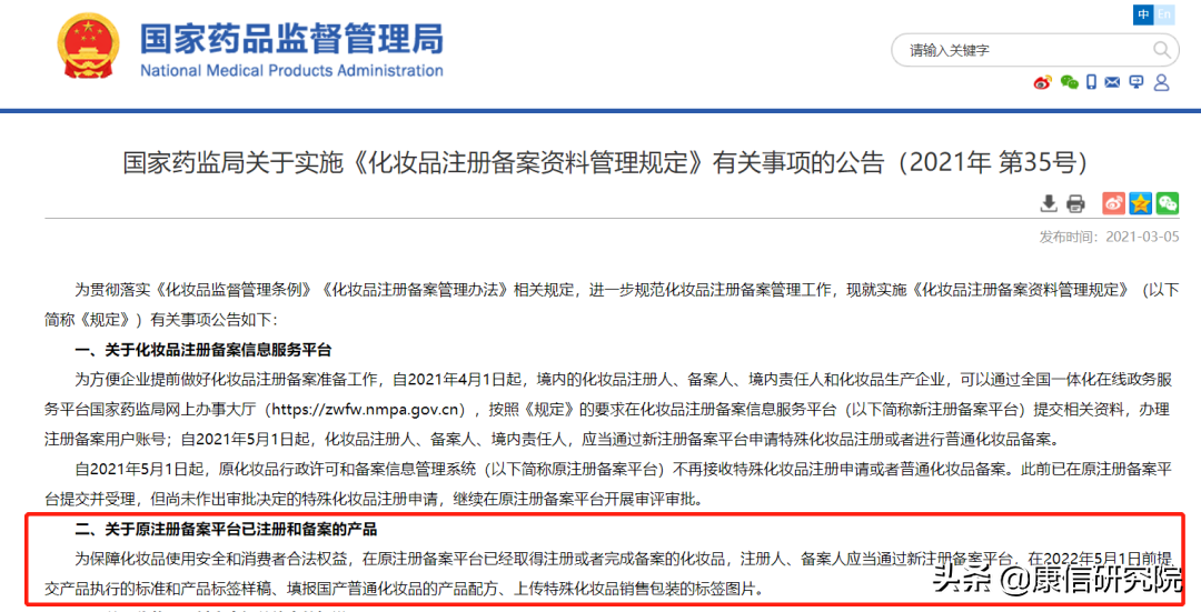 此外,藥監(jiān)局關于實施《化妝品注冊備案資料管理規(guī)定》有關事項的公告,規(guī)定:在原注冊備案平臺已取得注冊的化妝品,注冊人應當通過新注冊備案平臺,在2022年5月1日前上傳特殊化妝品銷售包裝的標簽圖片。