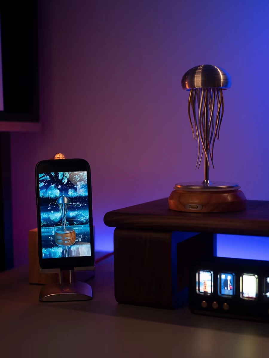 它有無(wú)線和有線兩種充電方式,續(xù)航能力達(dá)15小時(shí)。搭配漸變的玻璃罩,很有氛圍感。實(shí)木底座也很加分,應(yīng)該說(shuō)這款仿生機(jī)械水母不只是一個(gè)擺件,更像一件藝術(shù)品。