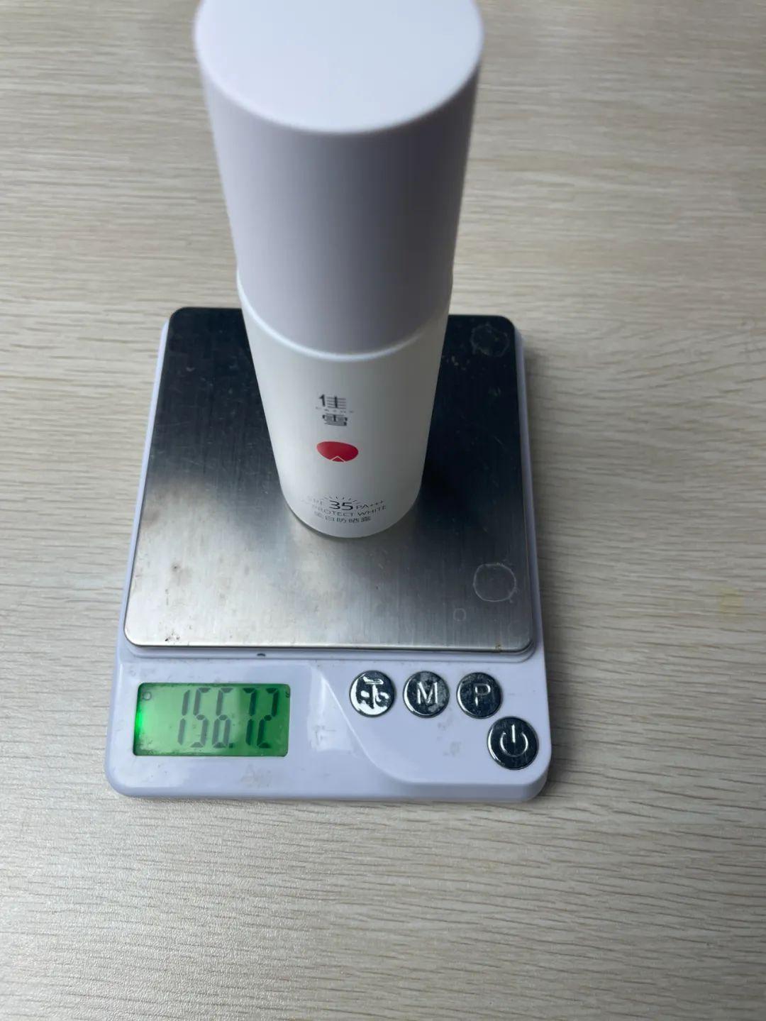 這次測評的防曬霜,大部分都是塑料包裝,其中佳X是玻璃瓶裝,里面的防曬霜才40g,總重量卻有156g??雌饋硇⌒∫黄?,放在小手提包里很重。