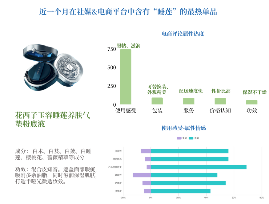 2022年4月,玻尿酸、煙酰胺和視黃醇持續(xù)成分排行榜前三。前五名與上個月保持一致,積雪草成為熱度持續(xù)在線的植物成分。在護膚和彩妝兩個品類的成分排行中可以看出,自然界中珍稀的植物成分及中草藥成為隨著夏季的漸入迎來新一波增長,其中以強大的保濕修護功為主。在春夏時期需要鎖水、抗炎同時防止光老化上,睡蓮成為應季成分?;ㄎ髯佑駱s睡蓮養(yǎng)膚氣墊粉底液是綜合社媒和電商熱門的單品。