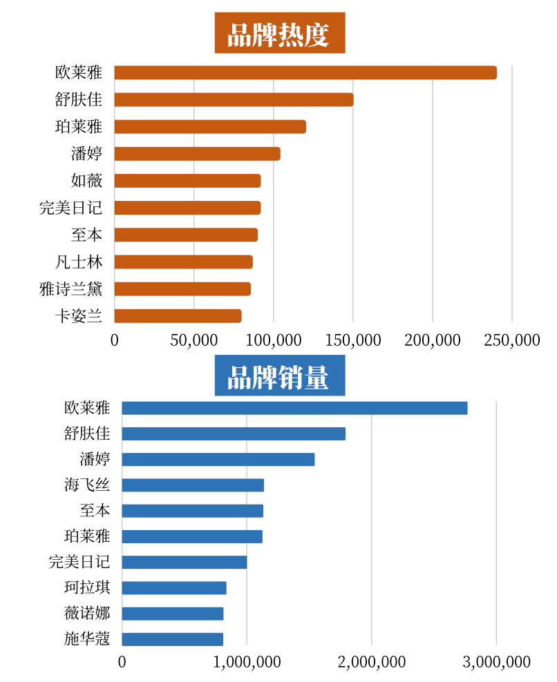 2022年4月,整體熱度和銷量發(fā)生較大變化:雙榜中都以國外品牌為主的個護品牌占據(jù)前十近一半的版圖,剩下的一半被國產品牌搶占,其中彩妝與護膚各占一半。歐萊雅、日記和舒膚佳分別代表護膚、彩妝和個護三個品類坐穩(wěn)熱度和銷量雙榜前三。