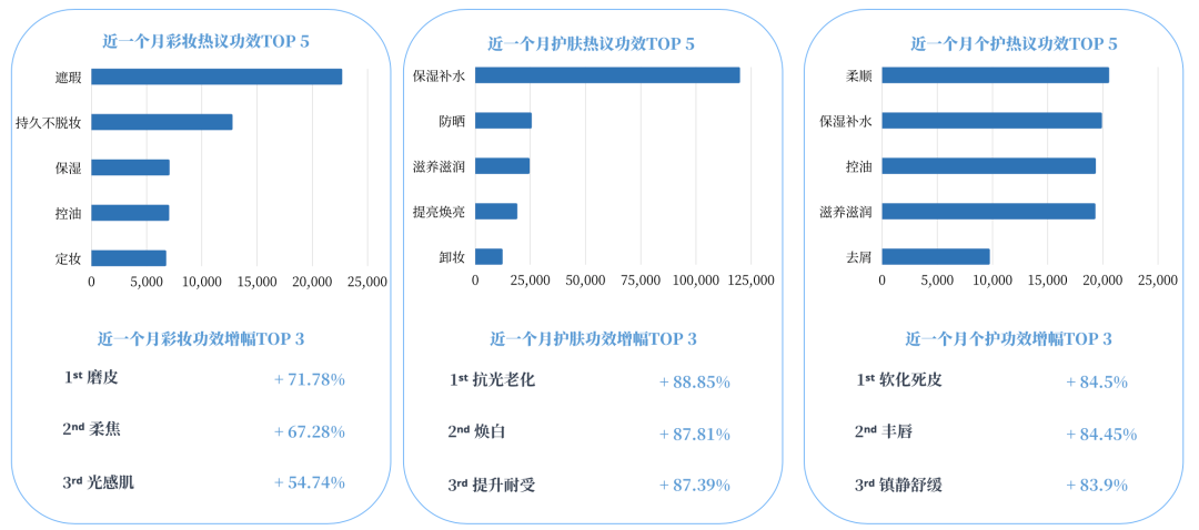 2022年4月,彩妝和護膚熱議功較上月持續(xù)回暖,平均上升70%。在彩妝功增長榜中,遮瑕柔焦連續(xù)兩個月成為增幅排名第二的功。從護膚功增長榜中看到,防曬需求持續(xù)走高,繼上月的第五名快速升到第二名的位置,相對應地防曬細分功抗光老化和煥白成為本月增幅大的功。在個護功增長榜中,控油持續(xù)變成天氣熱起來后個護產品的“剛需”。