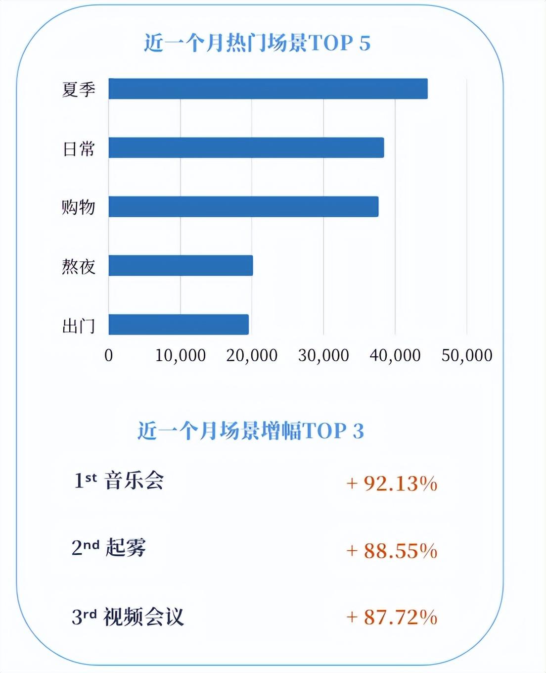 2022年4月,夏季成為本月熱門場景,日常和購物持續(xù)保持熱度,出門躋身前五場景排行。夏季場景的產品主要分為兩類,一個是防曬類型的產品,另一類是抵御夏季出油吃妝問題的彩妝產品。音樂會作為增幅第一的場景,其中突出妝感的修容和眼影產品熱度較高;由于疫情反復,視頻會議、宅家辦公及在家上課成為第三、四及六名增幅快的場景,其中具有儀式感舒緩心情的品類如面部精華、面膜成為隔離狀態(tài)下的必需品,底妝和口紅/唇膏兩個品類成為宅家視頻會議的救急彩妝產品。