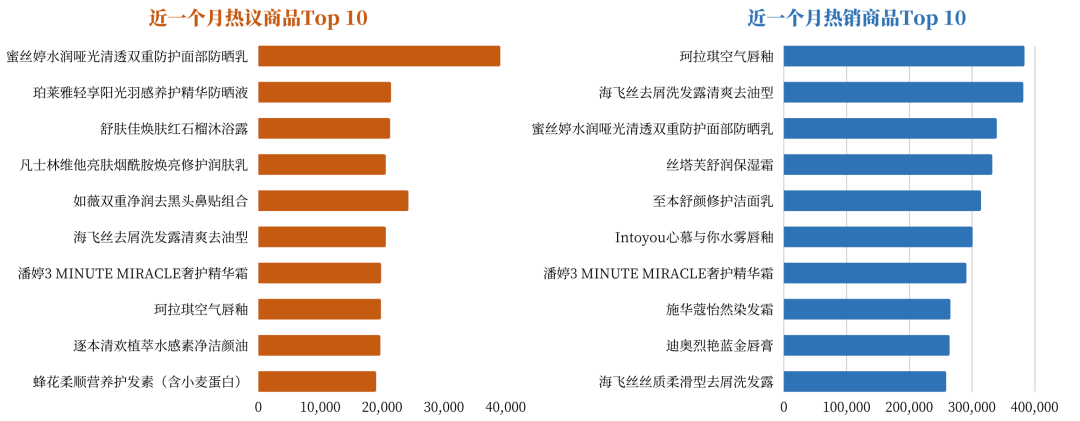 2022年4月,商品排行榜迎來新氣象。兩個防曬產品霸榜前兩位,身體和頭發(fā)護理緊隨其后,并成為熱度榜單上兩個熱門細分品類,品牌較為分散,舒膚佳、海飛絲、潘婷及老牌國產品牌蜂花榜上皆有名。守住熱度榜排位的珂拉琪空氣唇釉在銷量榜在守擂成功,熱度榜上大熱的身體和頭皮護理產品在銷量榜上表現(xiàn)一般,海飛絲和潘婷三個單品的熱度實在地轉化到了銷量上。
