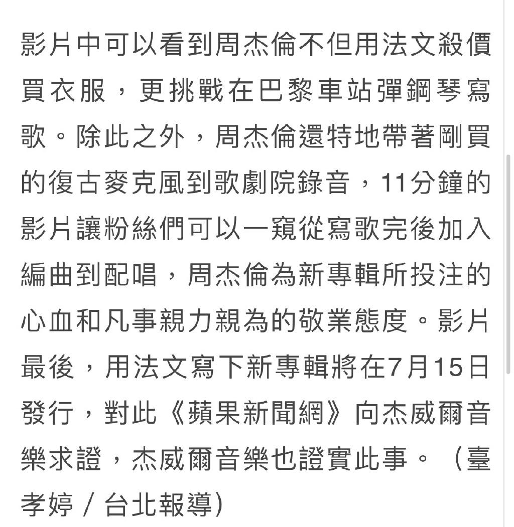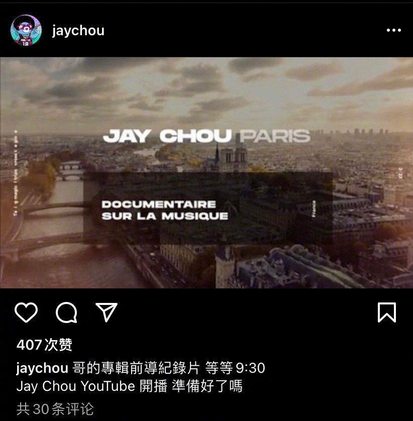 6月19日,周杰倫在Ins上預(yù)告21:30將發(fā)布專輯前導(dǎo)紀(jì)錄片,