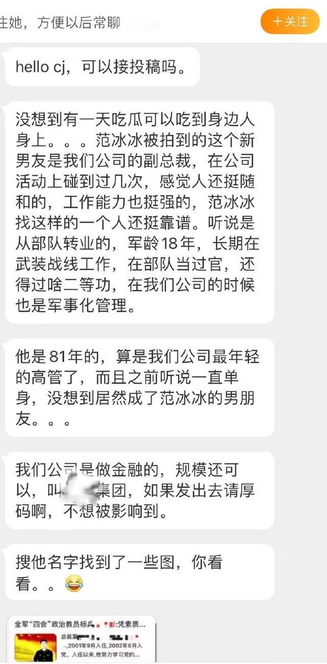 而且還有網(wǎng)友投稿,說范冰冰新男友是自己公司的副總裁,人挺靠譜兒,軍齡18年,還榮獲二等功。