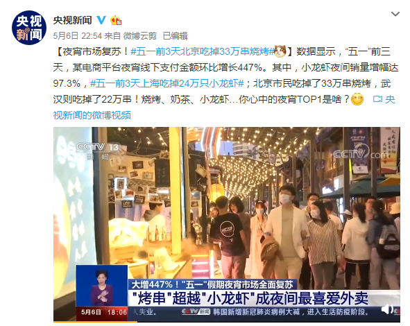 據(jù)新聞報道,"五一"前3天,北京市民吃掉了33萬串燒烤,上海市民吃掉24萬只小龍蝦,武漢市民吃掉了22萬串燒烤,南京市民每天都要吃掉60噸小龍蝦……所謂"吃貨"改變世界,夜宵市場的復(fù)蘇,讓很多被疫情影響的餐飲商家終于看到了希望。
