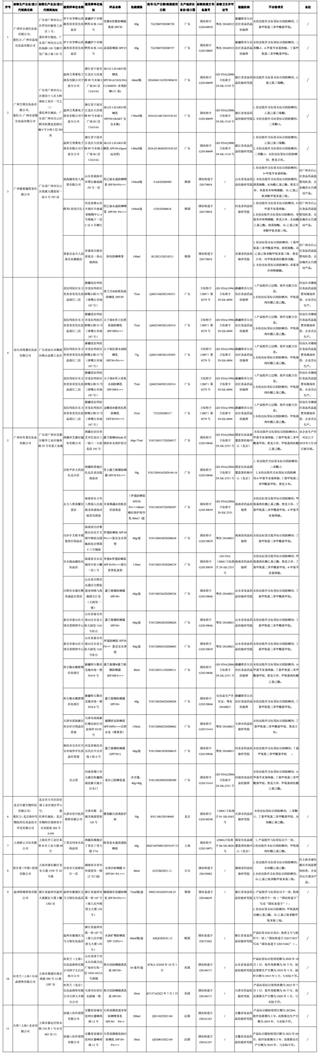 其中,經生產(代理)企業(yè)所在地食品藥品監(jiān)管部門現場核查,標示廣州蔓蒽施貿易有限公司代理的韓國玥之秘水晶防曬噴霧SPF50+PA+++和珍珠防曬噴霧,汕頭市綺嘉化妝品有限公司生產的格蘭杰?潤爽保濕防曬乳SPF30+、公子派?男士抗黑保濕防曬乳SPF30PA+++、公子派抗黑水潤防曬乳SPF30+PA+++、公子派?男士勁爽水潤防曬乳SPF30PA+++和金酷郎?抗黑防曬乳(SPF30+PA+++),資生堂(中國)投資有限公司代理的日本安熱沙防曬露N SPF30+PA +++等相關批次產品,標示生產(代理)企業(yè)否認為該企業(yè)生產(代理)。