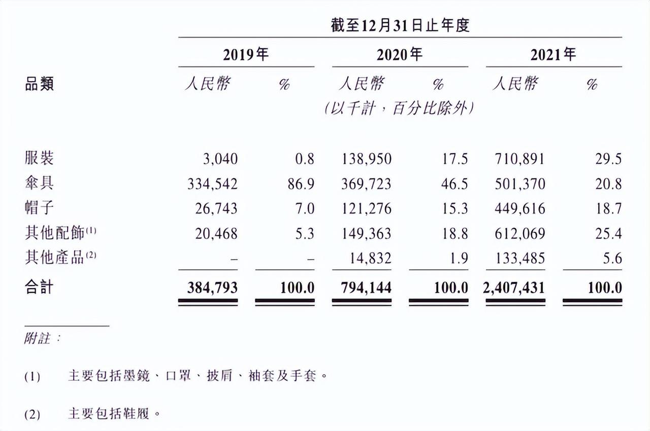 具體而言,蕉下的營收中,傘具的占比逐年下降,2019年到2021年分別為86.9%、46.5%和20.8%,服飾品類和配飾系列比重在連年攀升,2019年,二者占比分別為0.8%和5.3%,到了2021年則達到了29.5%和25.4%,成為兩大支柱品類。