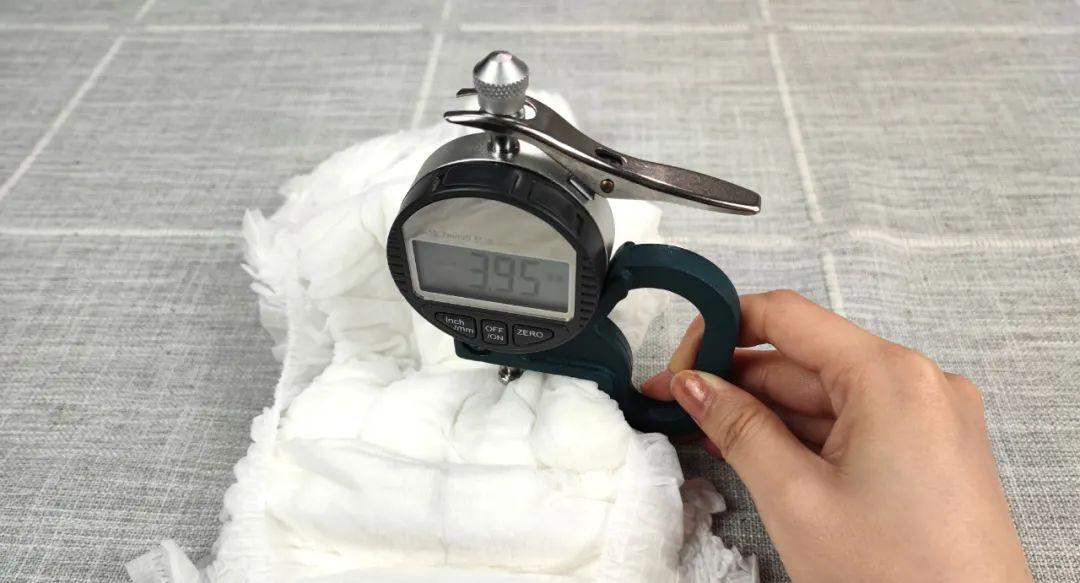 測試方法:用測厚規(guī)多次測量拉拉褲中心部位厚度,取平均值。