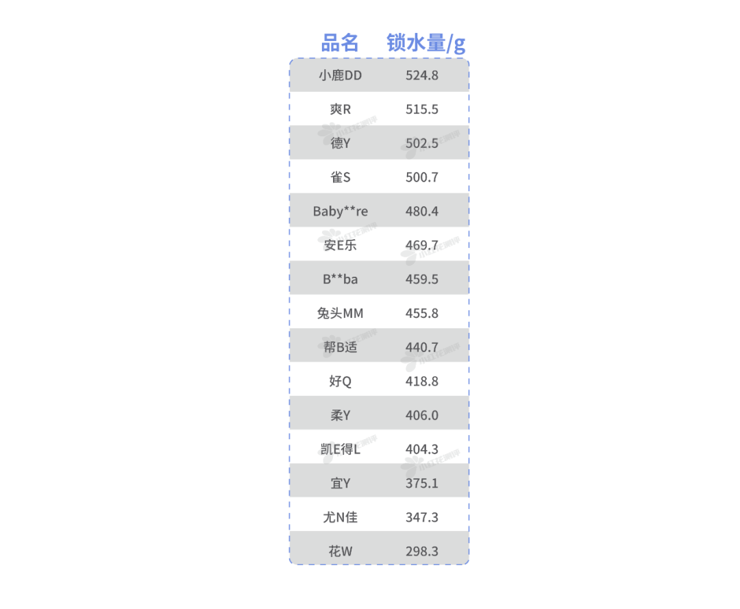 1. 小鹿DD、爽R、德Y、雀S、Baby**re、安E樂、B**ba、兔頭MM,這8款鎖水量都達到450g以上,不容易因為吸收尿液過多而漏尿,屬于表現產品。2. 鎖水量小的是花W,為298.3g,不過也能吸收3、4泡尿液(按照80mL一泡尿液計算)。