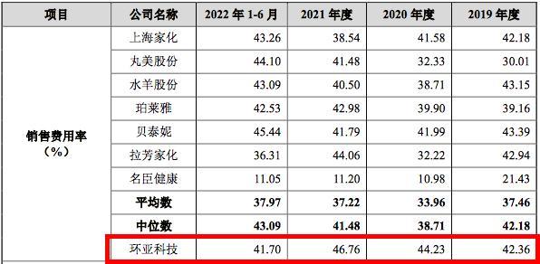 環(huán)亞科技也不遺余力地增加營銷推廣上的投入,營銷投入的逐年攀升。招股書披露,2019至2021年,環(huán)亞科技在品牌宣傳、市場推廣、渠道維護等銷售費用分別約為8.22億元、8.79億元、10.09億元,2022年前6個月,公司銷售費用也達到了約4.11億元。報告期內(nèi)三年半間,環(huán)亞累計銷售費用超31.21億元,其中2021年度銷售費用率高達46.76%,高于同行業(yè)公司平均水平。