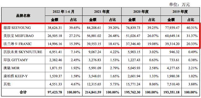 財報數(shù)據(jù)顯示,2021年,“滋源”、“美膚寶”、“法蘭琳卡”三大品牌的累計營收占公司總營收的84.09%,分別實現(xiàn)營收8.42億元、5.69億元和3.96億元。