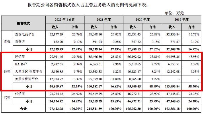 經(jīng)銷、KA渠道、代銷占比高,直營店等線上平臺發(fā)力不足,導(dǎo)致環(huán)亞科技在渠道布局上存在較大風(fēng)險。據(jù)環(huán)亞科技招股書披露,2019年、2020年、2021年、2022年1-6月,公司通過經(jīng)銷商渠道實現(xiàn)的銷售收入,占主營業(yè)務(wù)收入的比例分別為58.7%、48.99%、46.82%、52.15%。相比較同行業(yè)的丸美股份、華熙生物、貝泰妮等頭部公司,環(huán)亞科技的銷售渠道布局對經(jīng)銷商渠道的依賴程度較高。