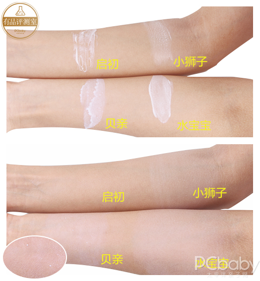 水寶寶和啟初都是乳液質(zhì)地,啟初更加水潤,完全涂抹開膚色沒有什么變化;水寶寶比較難抹開,且顏色偏白;貝親是涂改液質(zhì)地,流動性特別強(qiáng)(使用時麻麻要小心了),涂抹開后顏色也是四款里面白的,還搓泥,這得扣分;小獅子是噴霧型,噴前要先搖一搖,上手時感受到一絲冰涼,涂抹時水潤感十足也不泛白。
