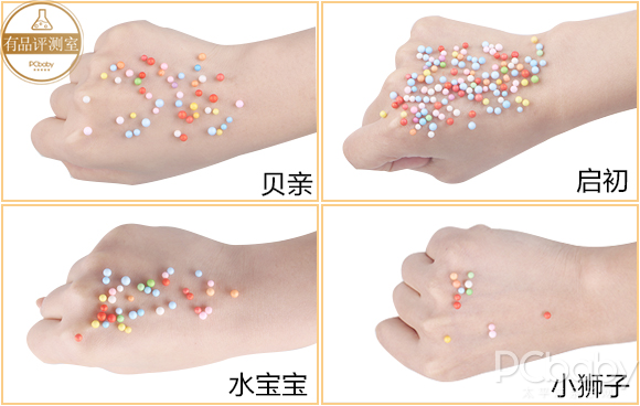 啟初成膜時間短,只需要1分鐘30秒的時間,但是卻是四款中油膩的,手上粘上的泡沫球多。其次是小獅子,成膜時間是2分鐘10秒,干爽型,手上幾乎沒有粘上泡沫球。水寶寶成膜慢,干爽程度和貝親差不多,屬于中等水平。