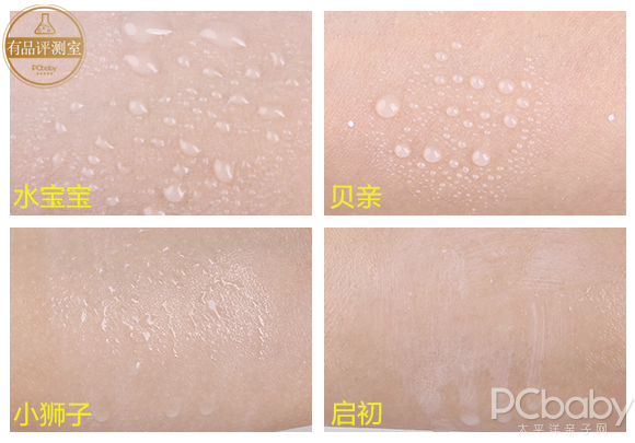 防曬霜成膜后噴水,觀察水的形狀。如果水匯成水珠且無色透明,說明防水能力好,如果水無法匯成水珠且渾濁,那防水性就很一般了。由圖可見水寶寶和貝親的防水性棒棒噠,其他兩款略差,扣一分。