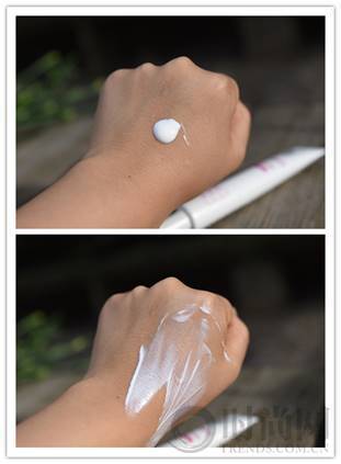 打開隔離,擠出適量涂抹于手背,隔離霜是白色的乳狀,可以看到產(chǎn)品質(zhì)地清瀅,感覺清薄透氣,聞到一股淡淡的清香。抹上很細(xì)膩,延展性好,輕輕抹就能推開。