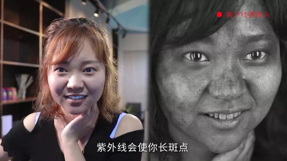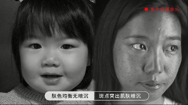下面是一位小朋友和一位二十幾歲成年女性,在紫外線鏡頭下做的對比,前者白玉無瑕,后者有的暗沉、斑點臉,兩者形成強烈對比。