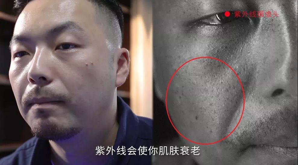大家可以看下面的“光老化”實驗,人臉在紫外線鏡頭下會暴露出肉眼不可見的“紫外線殘留傷害”。很多肉眼看起來皮膚不錯的年輕人,在紫外線鏡頭下一照,各種膚質(zhì)問題都暴露無遺了。