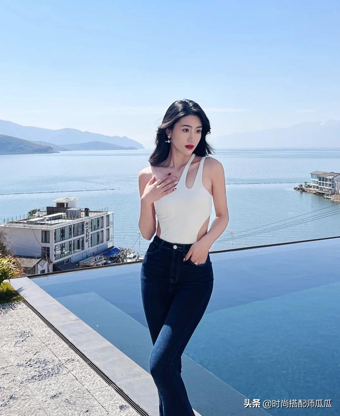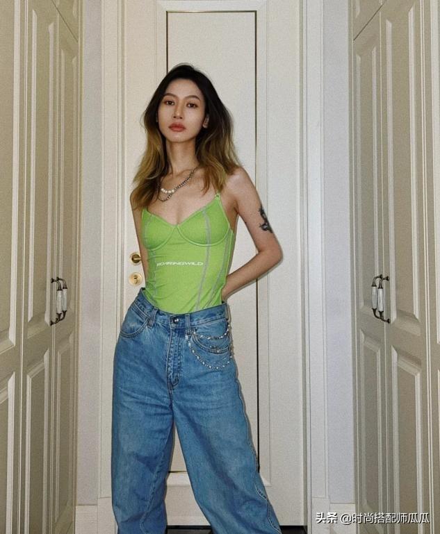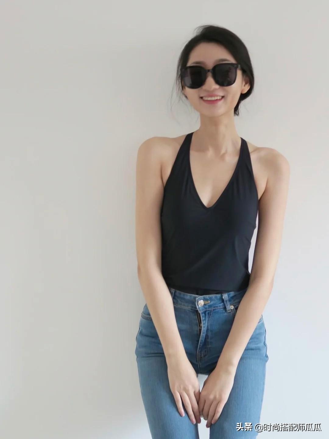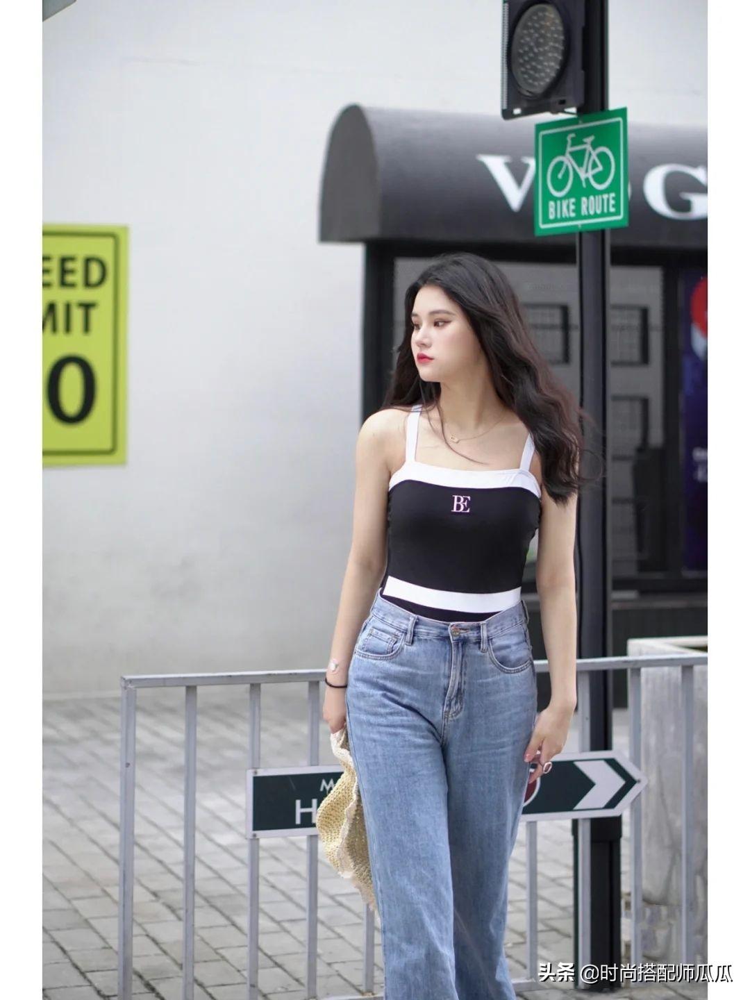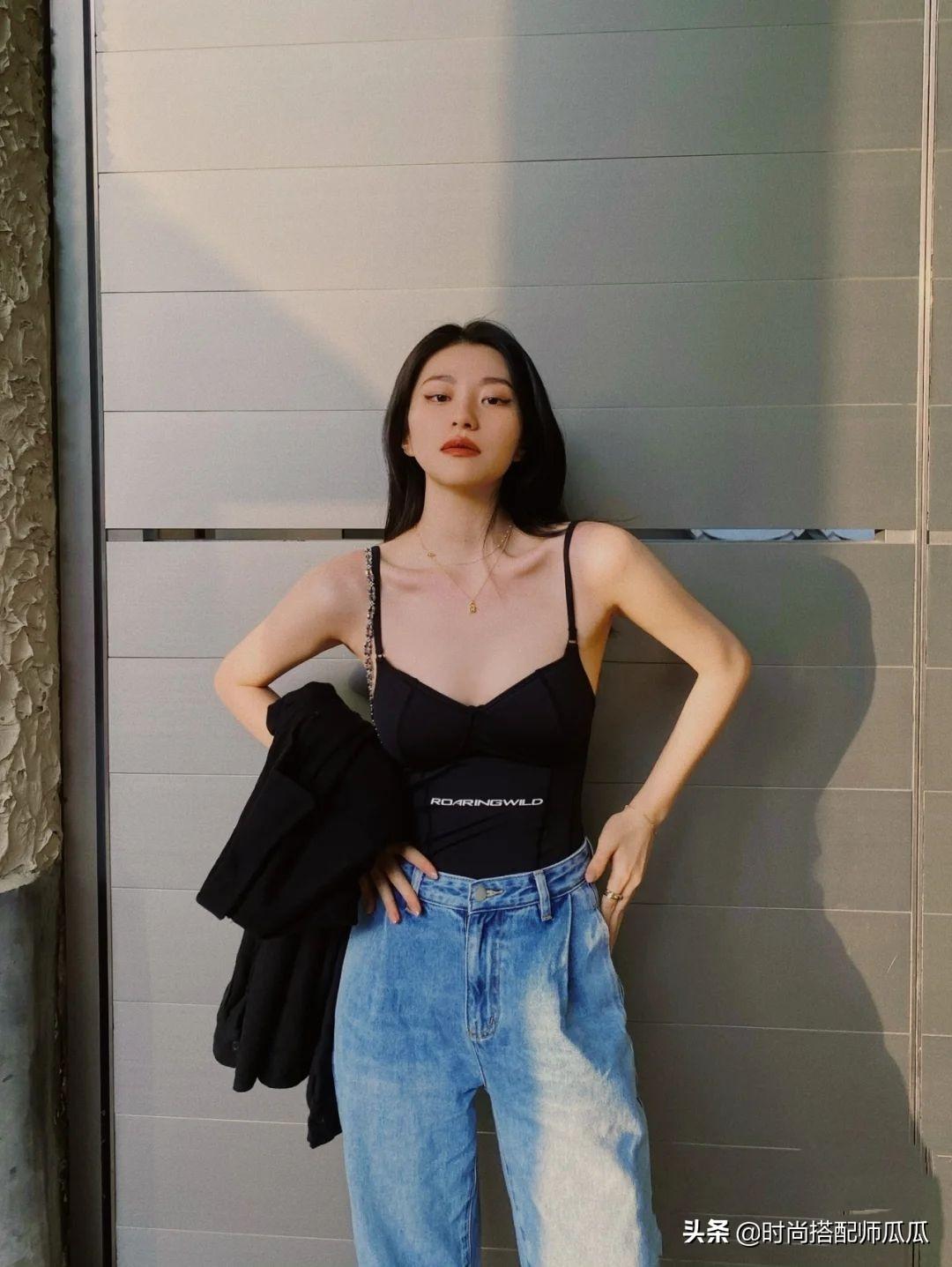 想要清新少女一些,就選背心、吊帶款式的,恰到好處的露膚,不至于過于成熟老氣,配上長牛仔褲,年輕減齡,看著很洋氣。在顏色的選擇上可以試試高級的莫蘭迪色系,淡雅的糖果色好看,還很顯白!