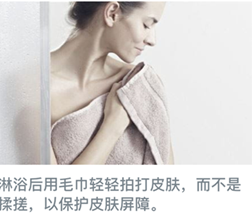 4.沖涼水溫35度左右,勿冷勿過熱,用溫和沐浴露,浴后3分鐘內抹護膚霜。