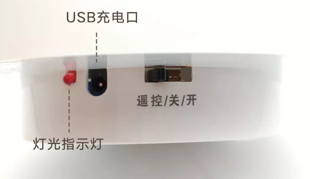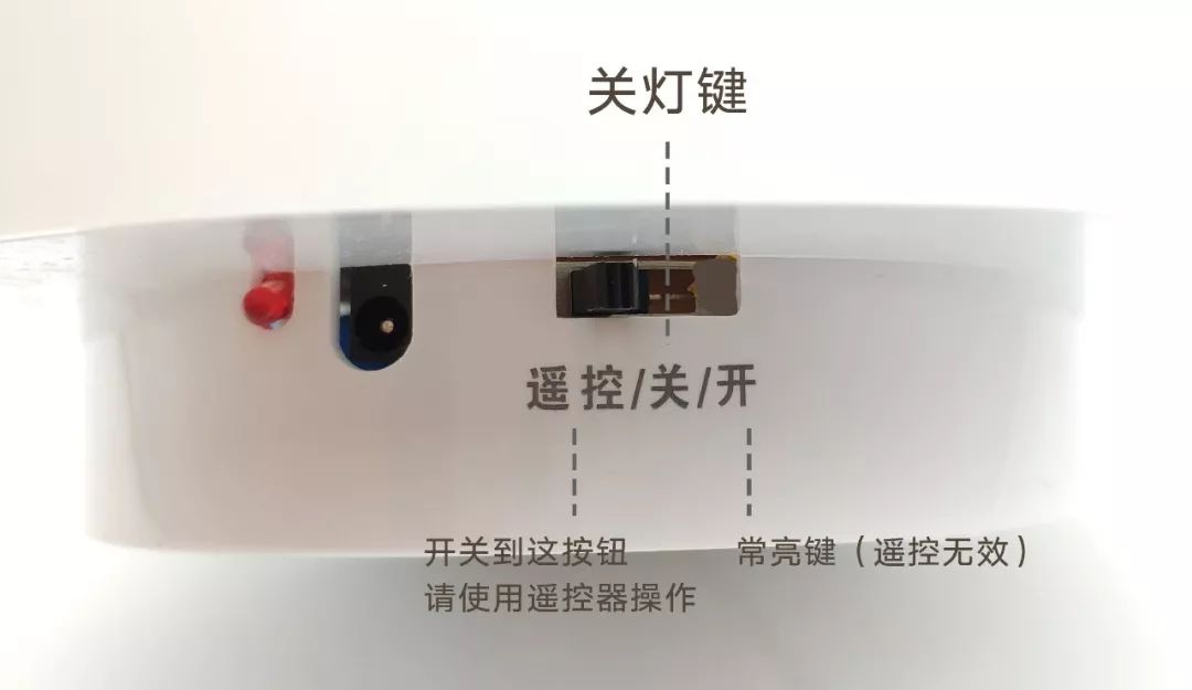 整體操作面板在燈的底部,往左是遙控模式,中間是關(guān)閉鍵,往右是長亮鍵。