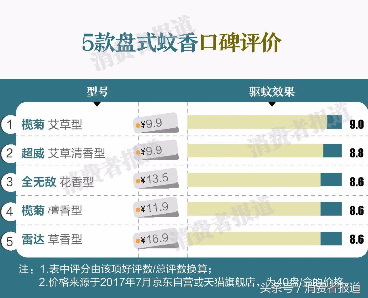消費者評價數(shù)據顯示,盤式蚊香的驅蚊效果是所有驅蚊產品中好的,在電熱蚊香液和滅蚊燈之上,而且價格便宜,10元左右能買到40盤左右,即滿足40夜的使用,使用時也無需電源驅動(電熱蚊香液、滅蚊燈需要)。