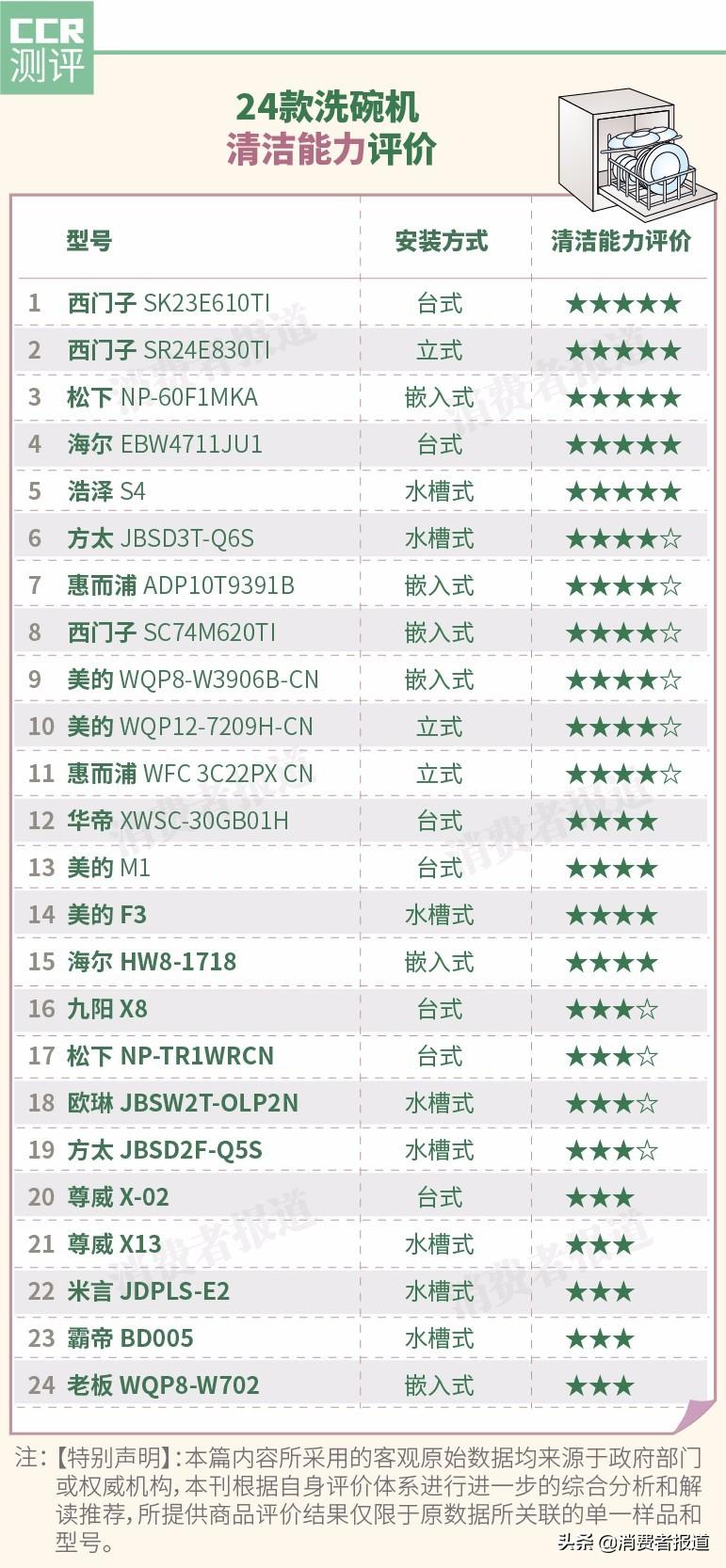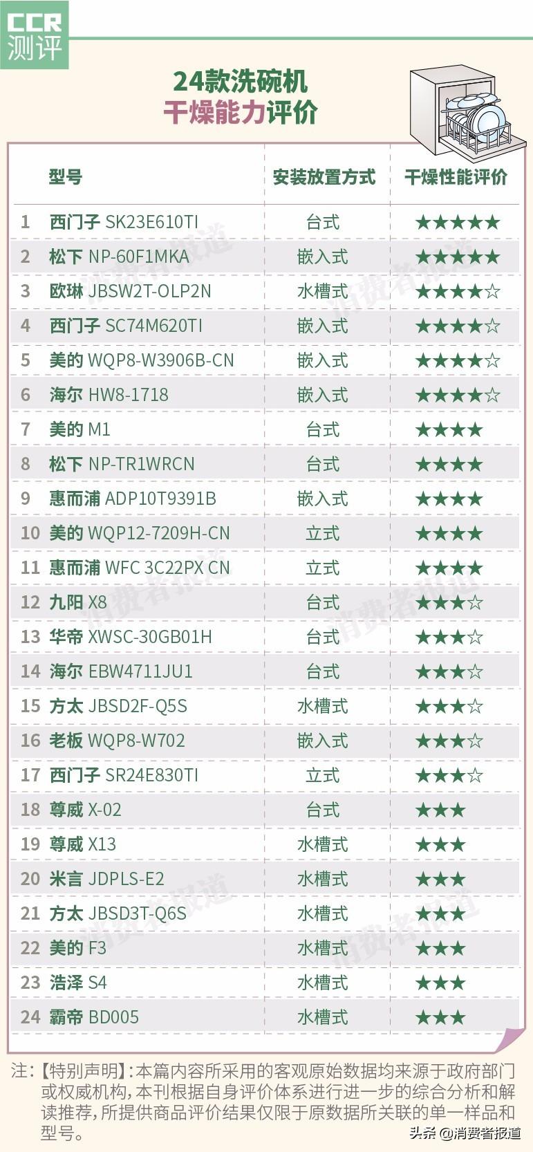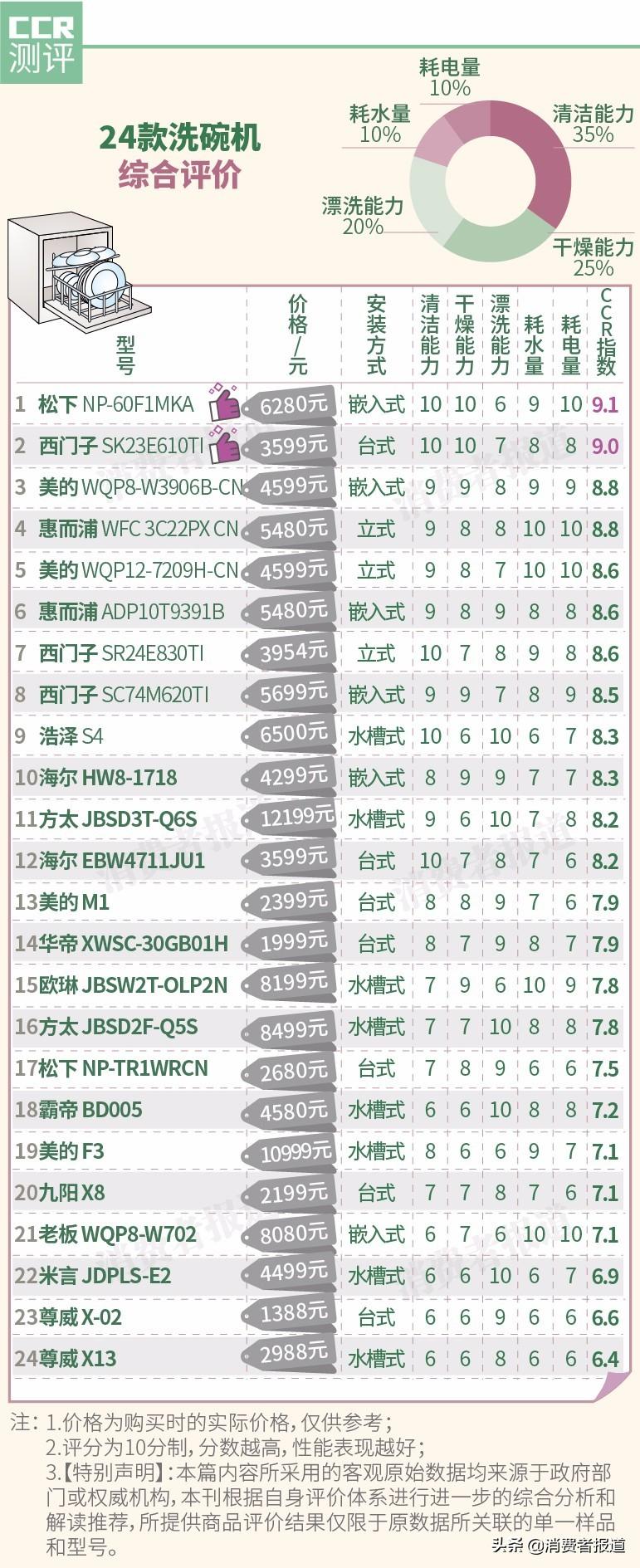 綜合清潔能力、干燥能力、漂洗能力、耗水量、耗電量等5項(xiàng)指標(biāo),得出24款洗碗機(jī)的綜合評(píng)分。