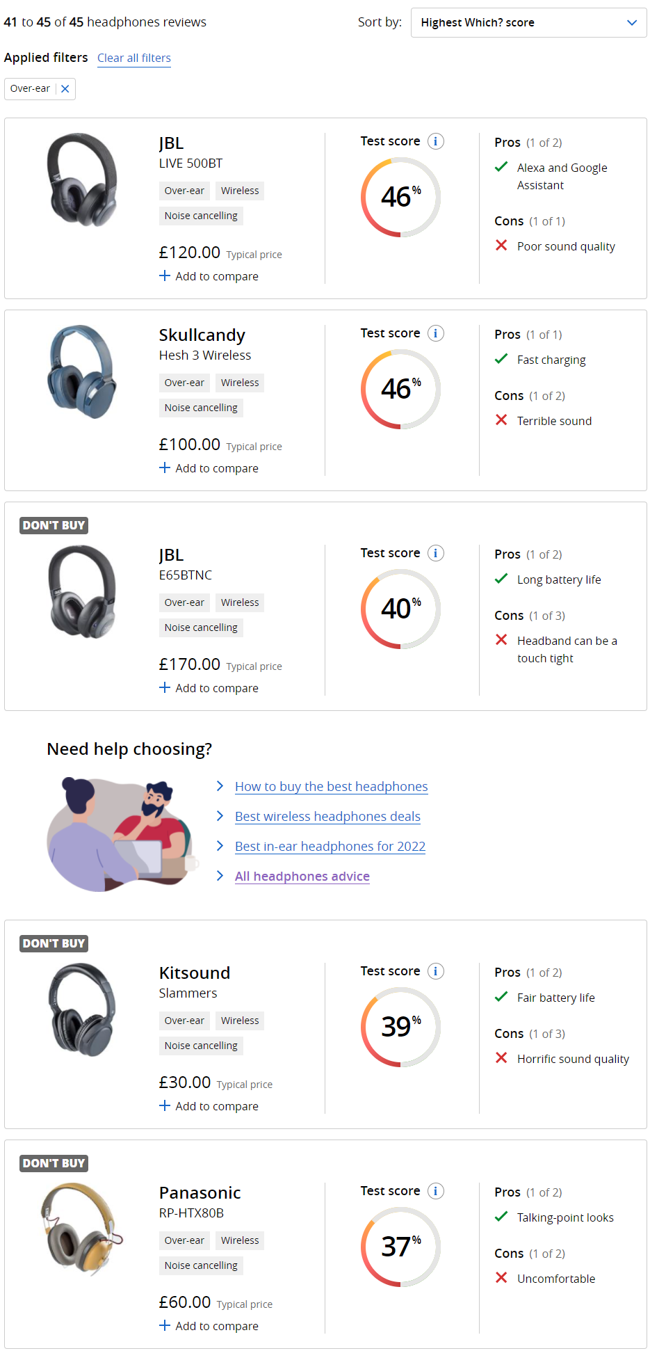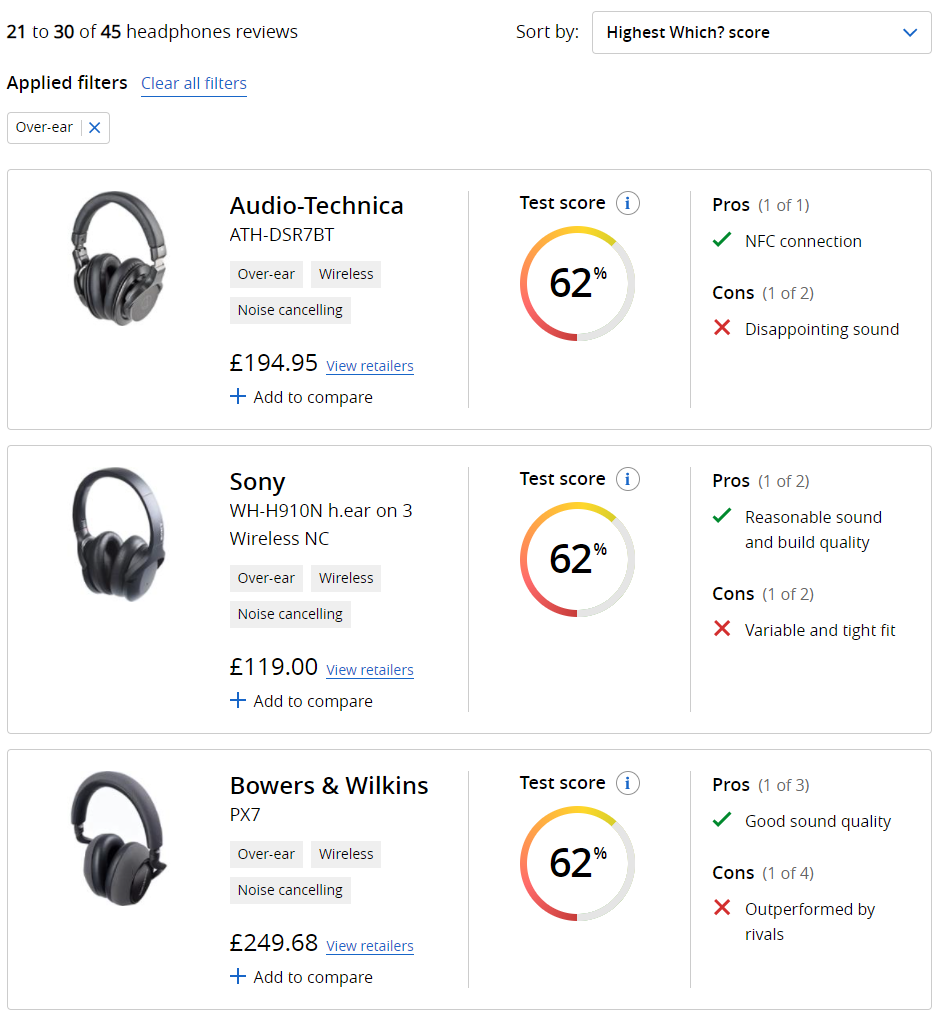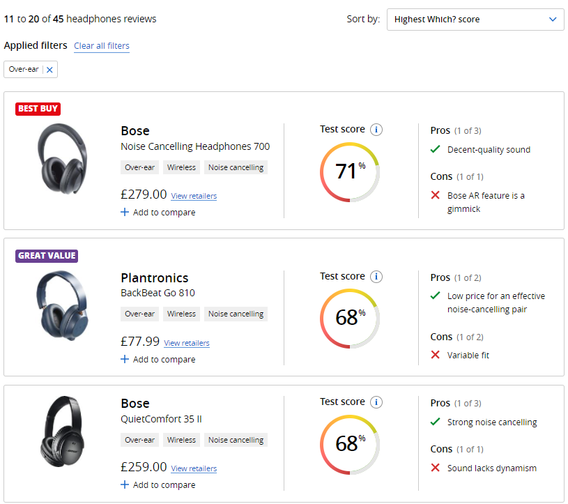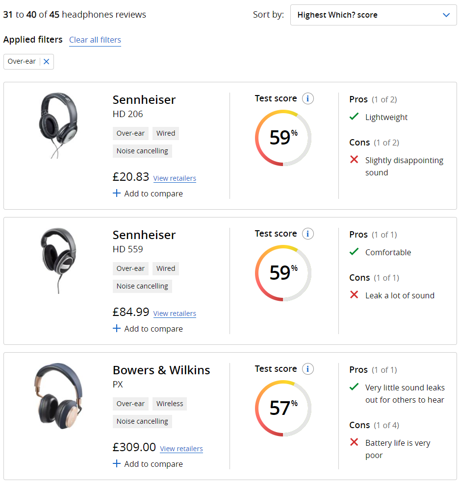 45款耳罩式耳機(jī)測試成績排名你已經(jīng)知道選擇哪個(gè)耳機(jī)品牌了嗎?你還可以參考英國消費(fèi)者組織的獨(dú)立、專業(yè)、詳實(shí)測試結(jié)果。我們之所以在實(shí)驗(yàn)室進(jìn)行嚴(yán)苛的測試,是因?yàn)橄霂椭M(fèi)者選擇正確的耳機(jī)。