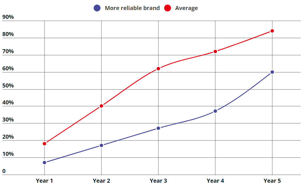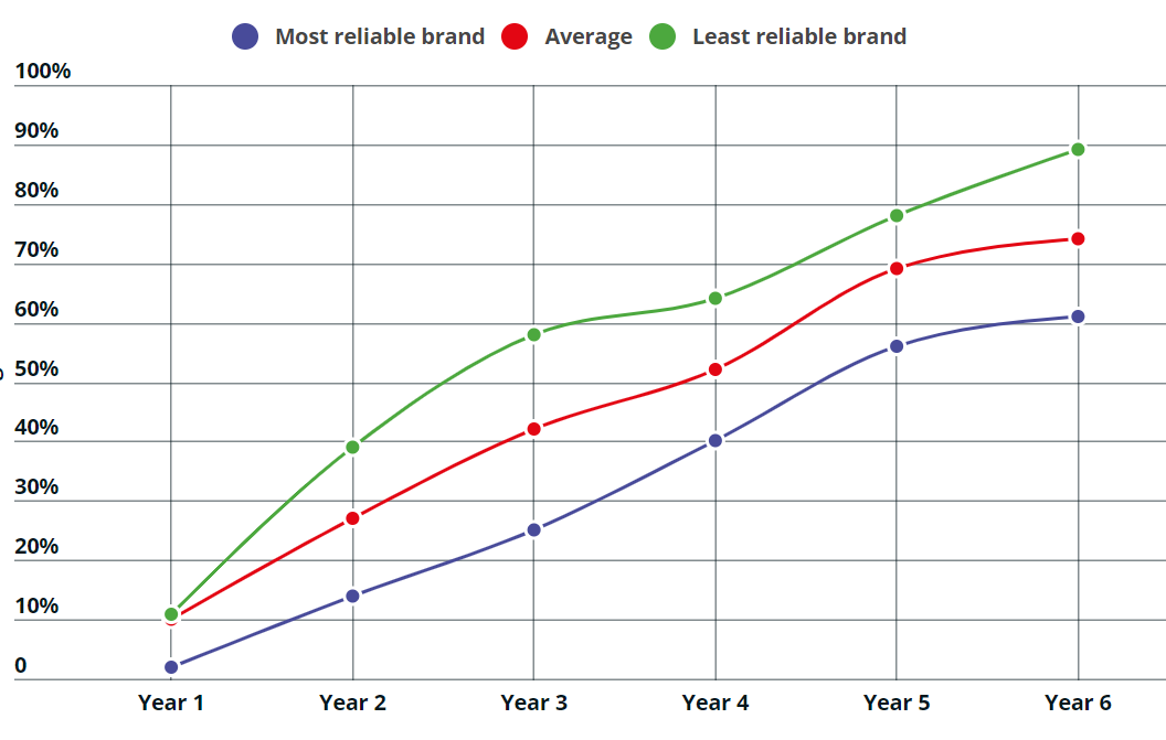 上圖中的曲線表示可靠(藍(lán)色)、不可靠(綠色)有線耳機(jī)品牌的逐年故障率走勢(shì)以及所有品牌的平均走勢(shì)(紅色)。由此可見,不同品牌之間的可靠性存在著巨大差異。