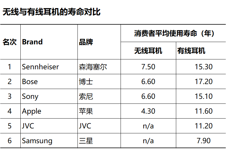 同品牌無線與有線耳機(jī)的壽命對(duì)比受訪消費(fèi)者持有并使用耳機(jī)的時(shí)間稱之為"消費(fèi)者使用壽命"(estimated consumer lifetime)。某品牌的消費(fèi)者使用壽命并不是指該品牌的耳機(jī)會(huì)在該時(shí)間段到期后突然停止工作,消費(fèi)者也可能會(huì)選擇更換一部還正常工作的耳機(jī)。