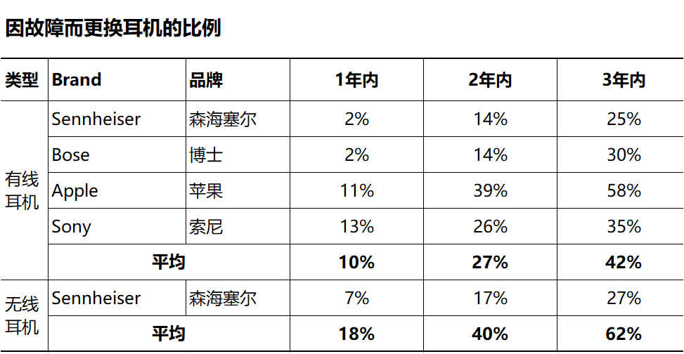因故障而更換耳機(jī)的比例調(diào)查數(shù)據(jù)不僅包括故障發(fā)生的頻率、故障的嚴(yán)重程度、故障發(fā)生之前使用了多久,還包括各個(gè)品牌因故障而終更換耳機(jī)的比例以及更換的原因。