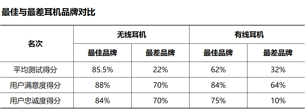 佳與差耳機(jī)品牌對(duì)比調(diào)查還包括人們對(duì)一個(gè)品牌的總體滿意程度,并據(jù)此計(jì)算用戶滿意度得分(customer satisfaction score),反映用戶是否會(huì)向朋友推薦該品牌。
